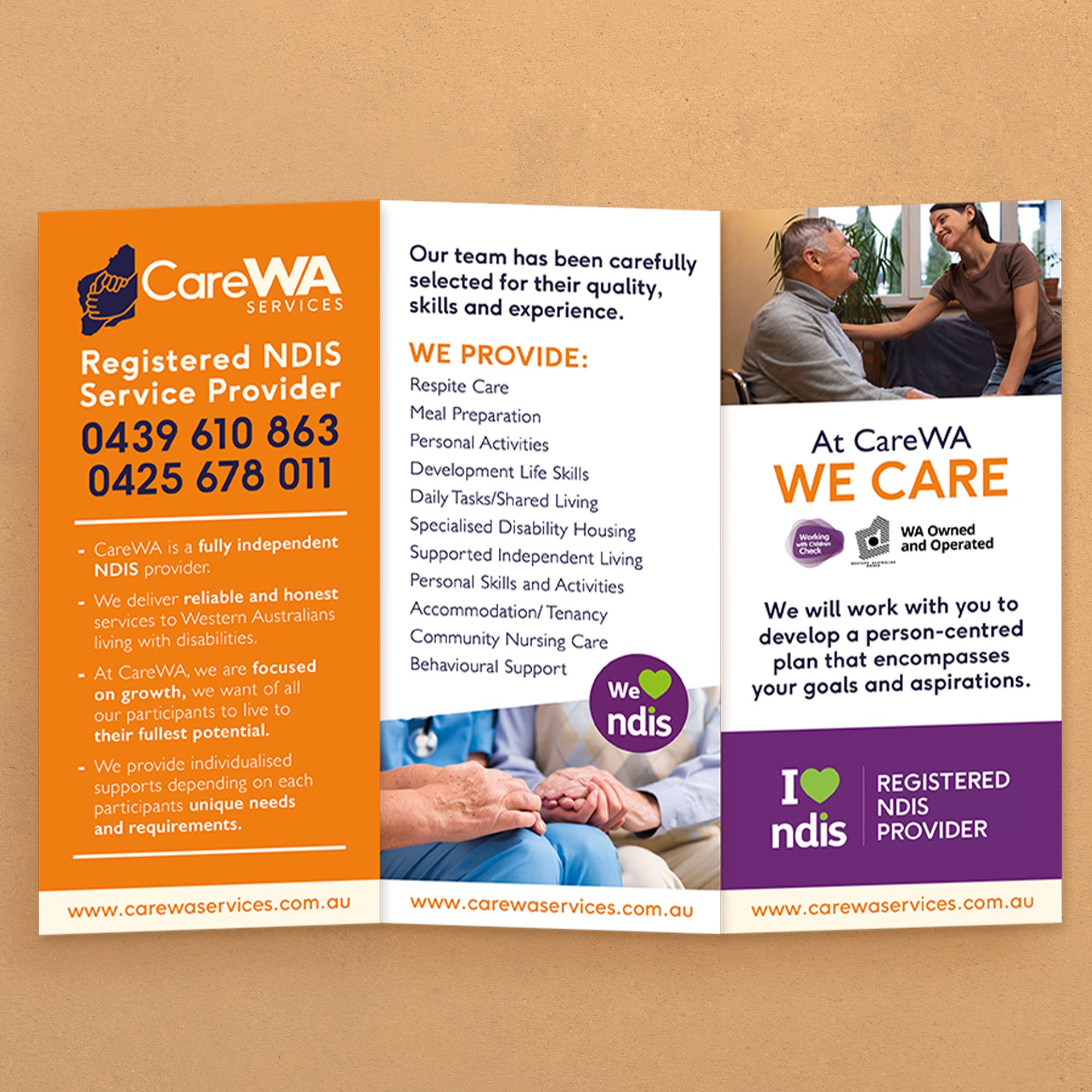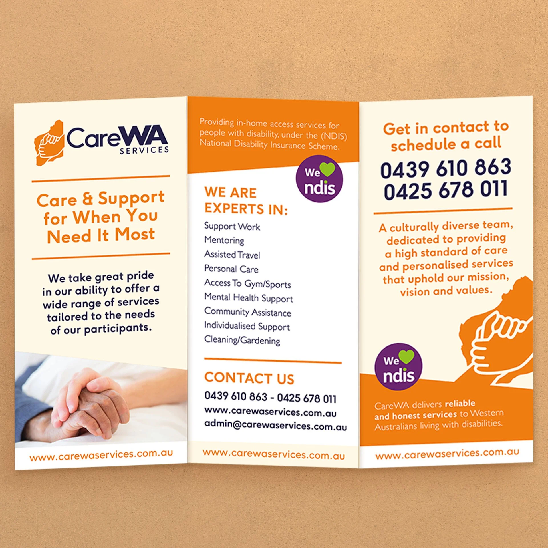 We also designed a brochure for CareWA to support their outreach and marketing as a Registered NDIS Service Provider. The brochure clearly communicates their services, values, and support offerings in an easy-to-understand format for potential clients and families. Using the refreshed branding, colour palette, and typography, we created a professional, accessible design that reinforces trust while helping CareWA effectively present their services in both digital and printed formats.