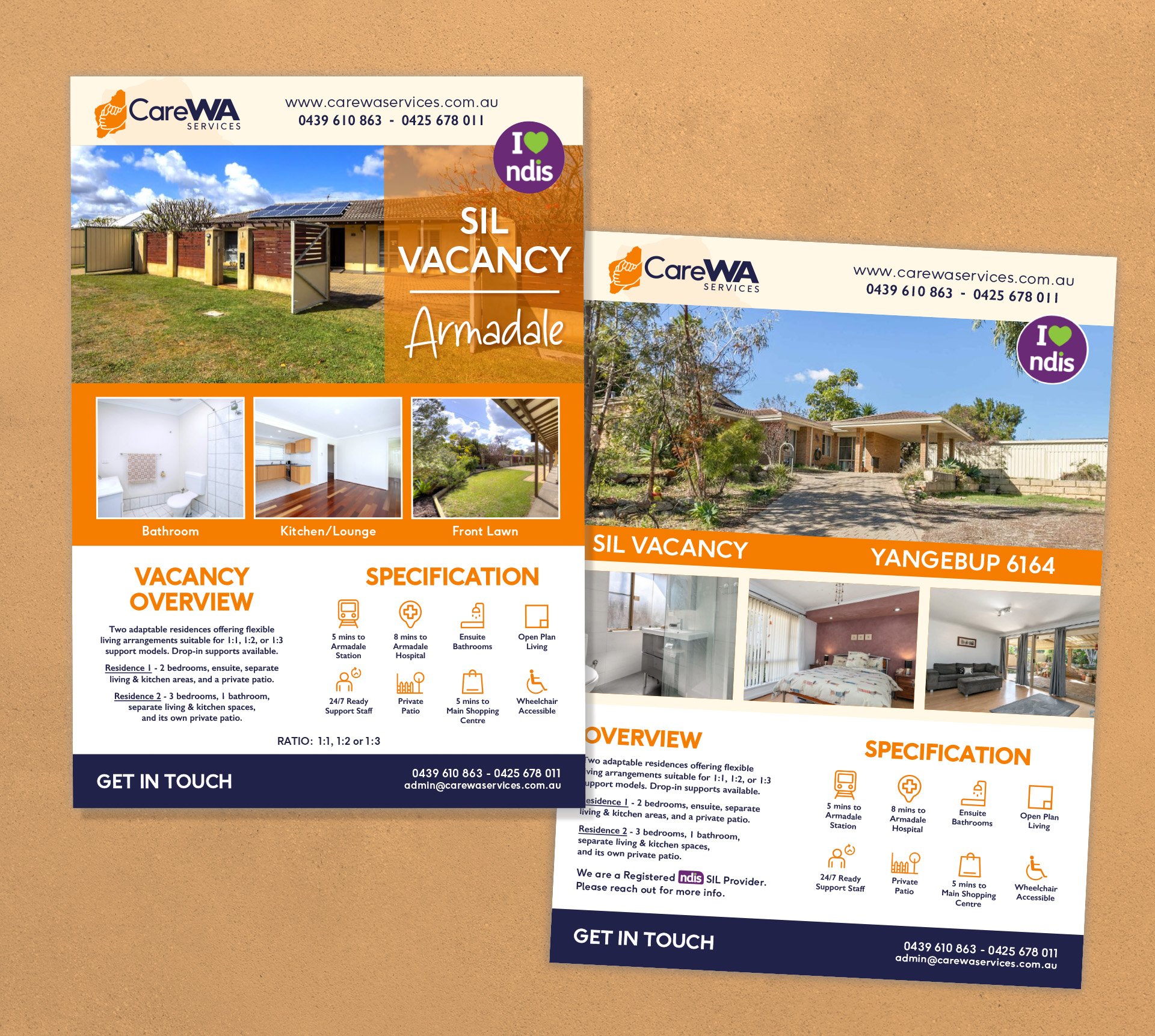The leaflets for CareWA’s vacant SIL buildings showcase their refreshed branding while clearly communicating key information about available properties.